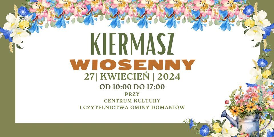 Centrum Kultury i Czytelnictwa Gminy Domaniów serdecznie zaprasza na Kiermasz Wiosenny, który odbędzie się 27 kwietnia (tj. sobota) w godzinach 10:00-17:00.
