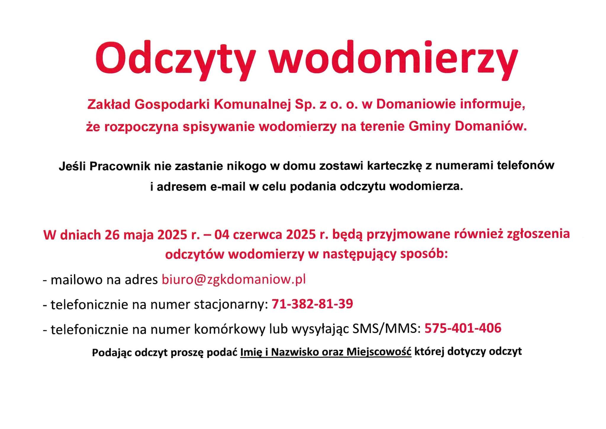 Zakład Gospodarki Komunalnej Sp. z o.o. w Domaniowie informuje, że rozpoczęto spisywanie wodomierzy na terenie Gminy Domaniów.