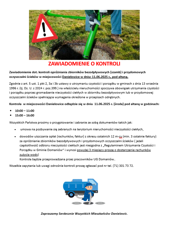 Zawiadomienie dot. kontroli opróżniania zbiorników bezodpływowych (szamb) i przydomowych oczyszczalni ścieków w miejscowości Danielowice w dniu: 11.06.2025 r., pod altaną.