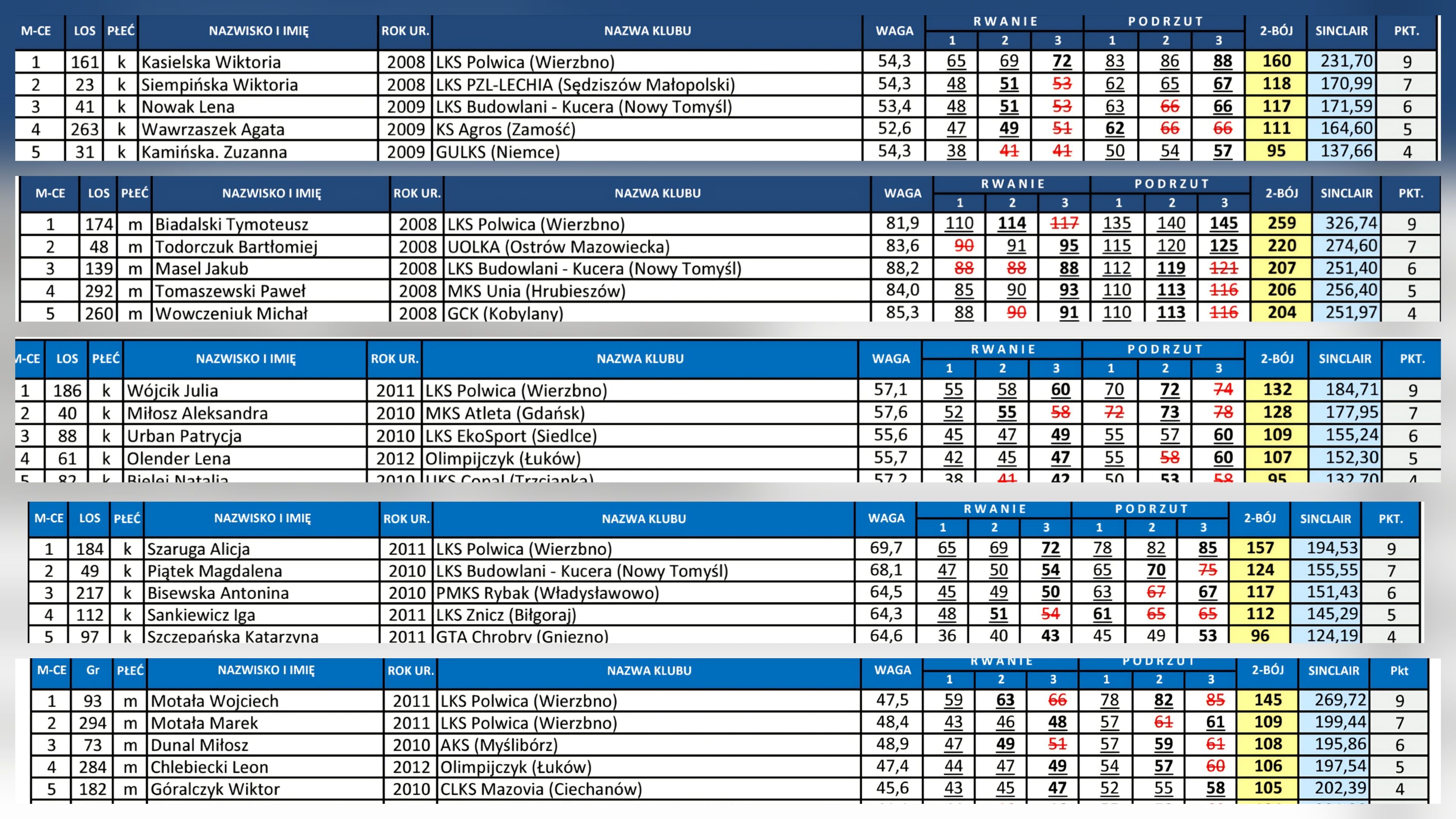 W tabelkach podane wyniki pierwszych piątek zawodników w kategoriach wagowych z naszymi zwycięzcami na MP LZS.