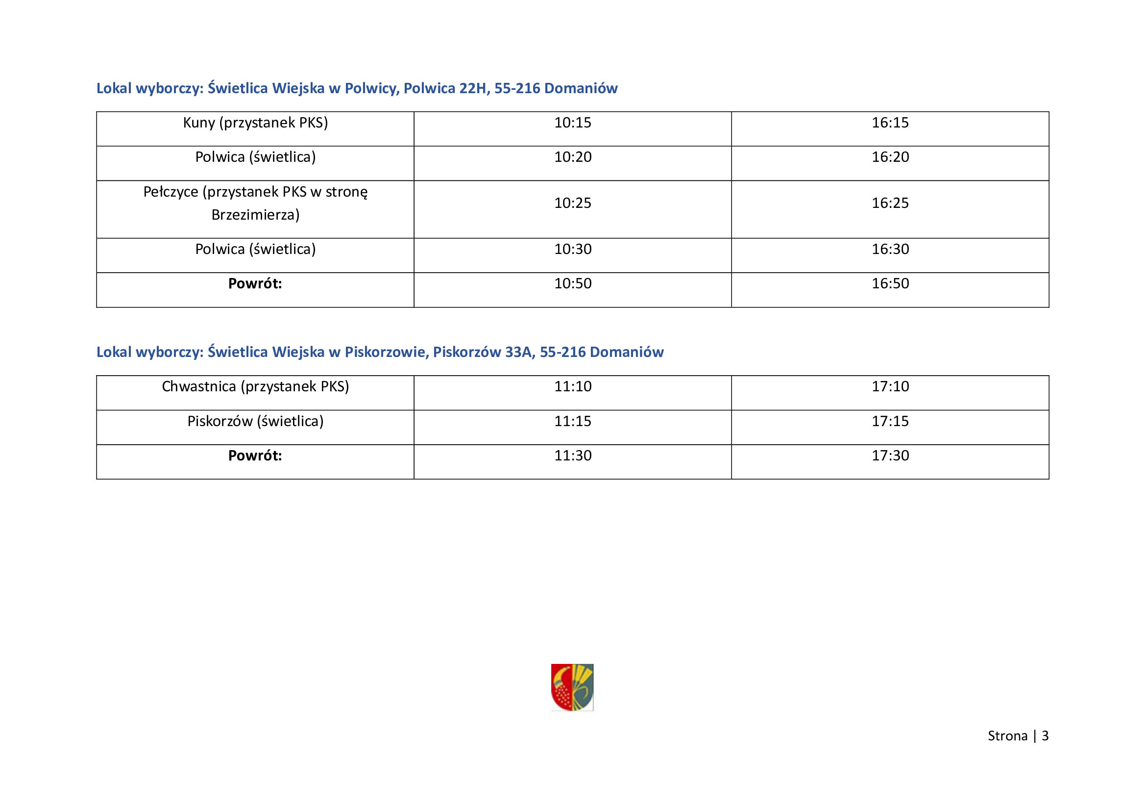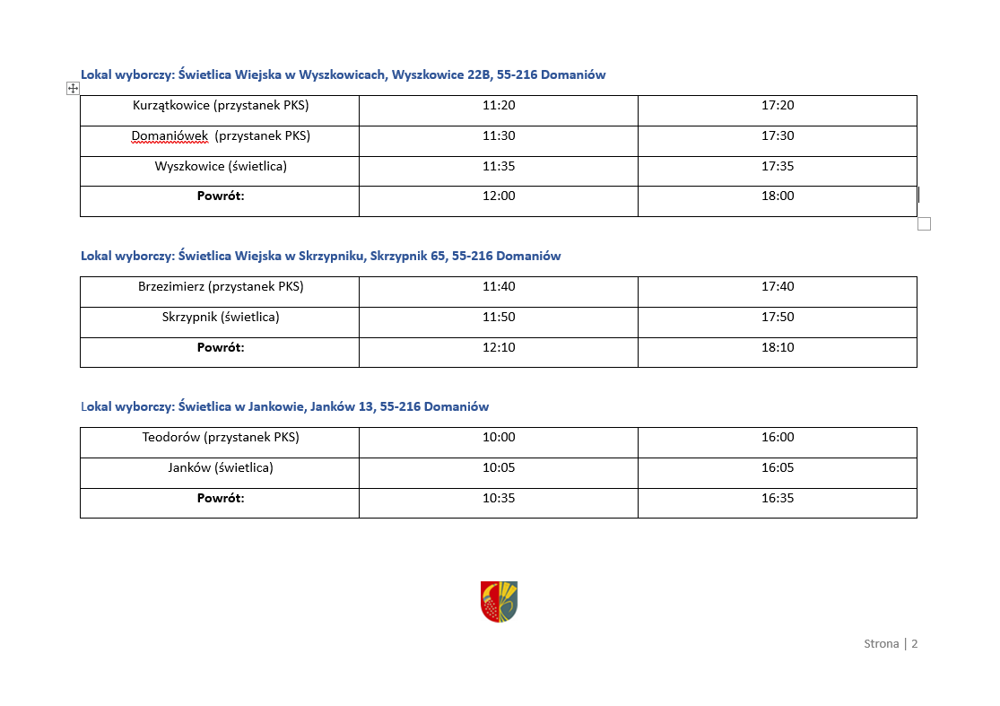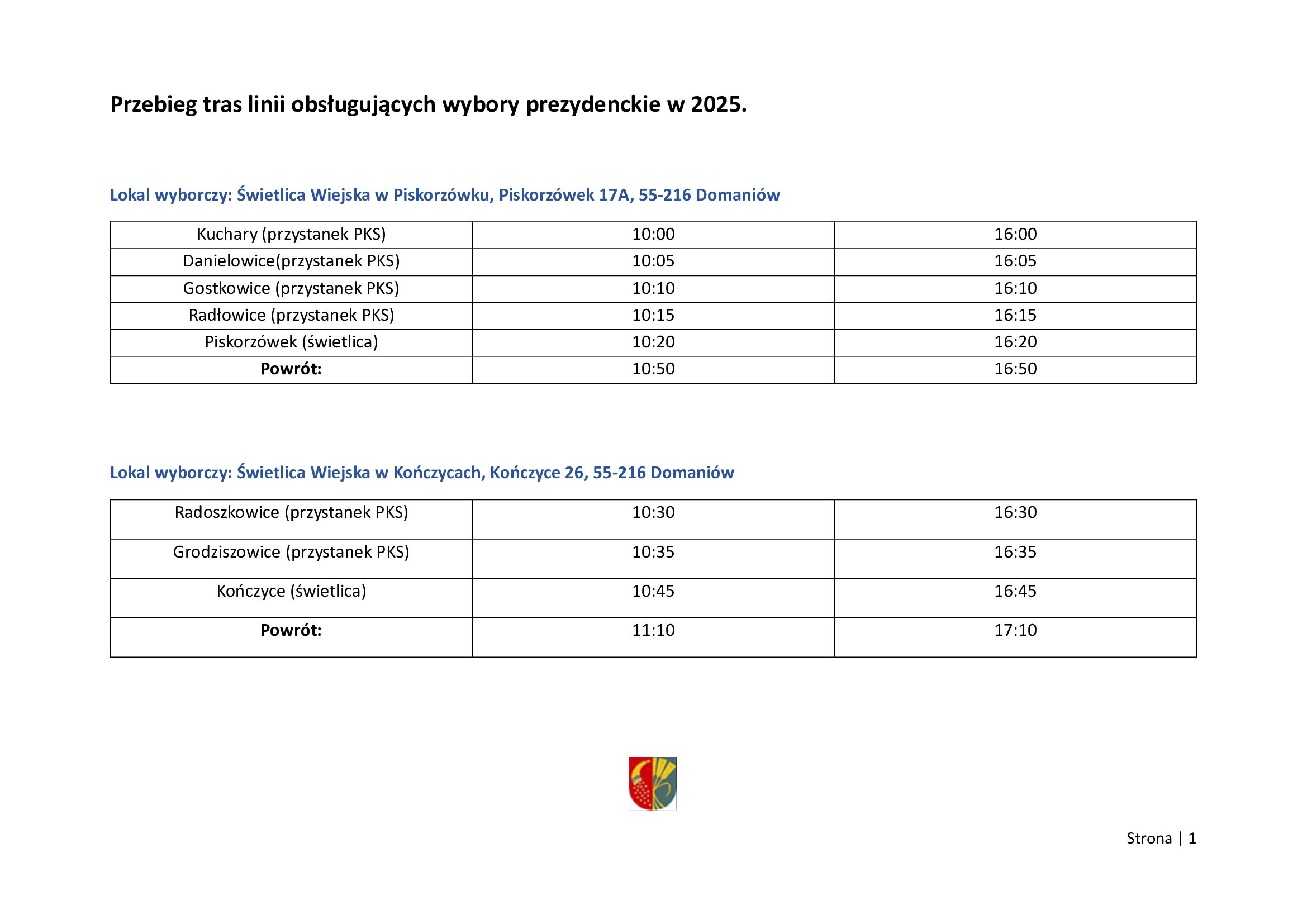 W celu zapewnienia wszystkim wyborcom udziału w II turze wyborów Prezydenta Rzeczpospolitej Polskiej zarządzonych na dzień 1 czerwca 2025r. Gmina Domaniów organizuje bezpłatne kursy busów dla wyborców z miejscowości, w których nie znajduje się lokal wyborczy.