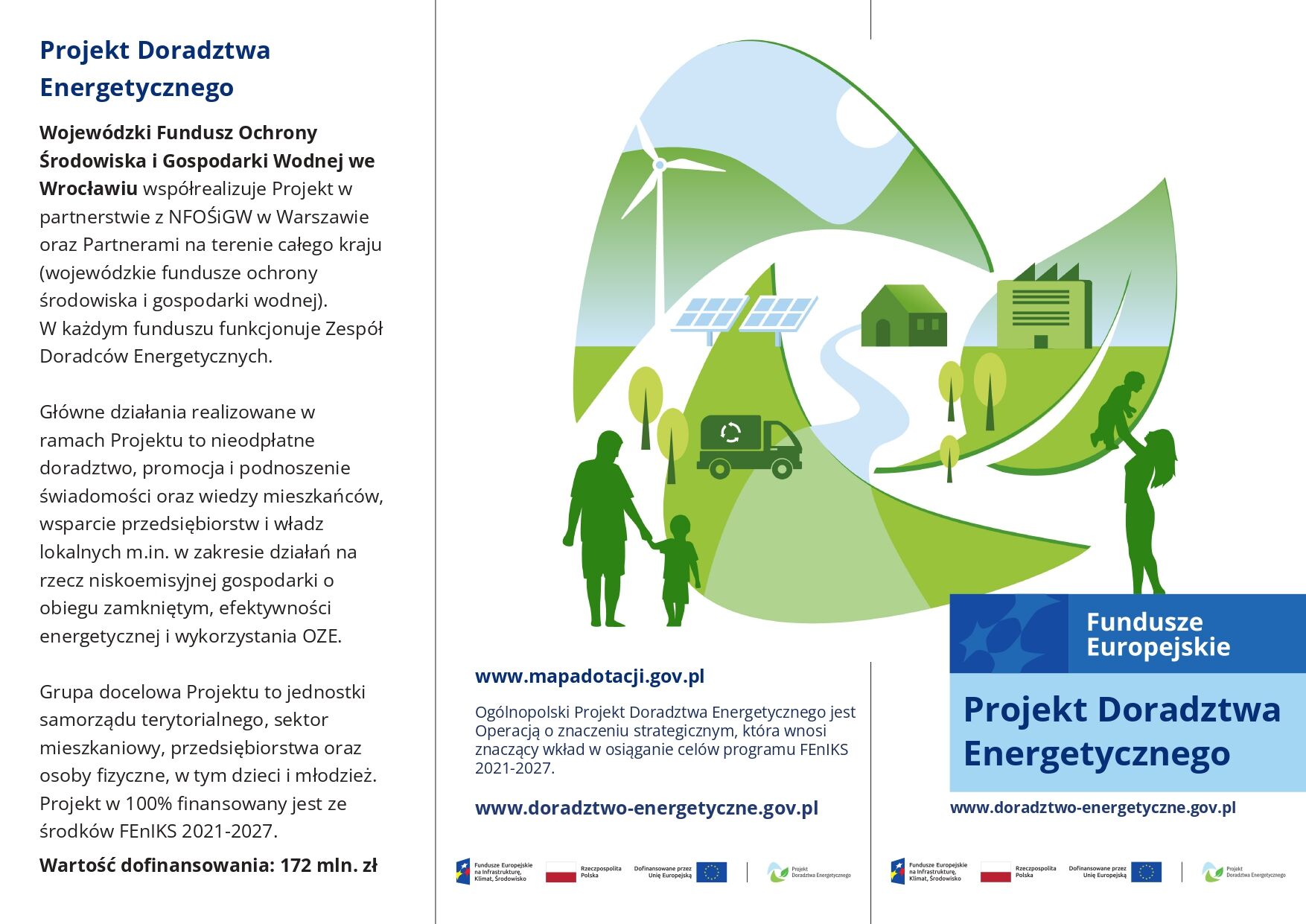 Projekt Doradztwa Energetycznego finansowany jest w 100% ze środków unijnych w ramach programu FEnIKS 2021–2027. Projekt realizowany jest przez NFOŚiGW we współpracy z 16 partnerami - wojewódzkimi funduszami ochrony środowiska.