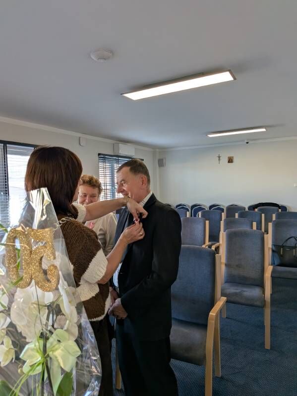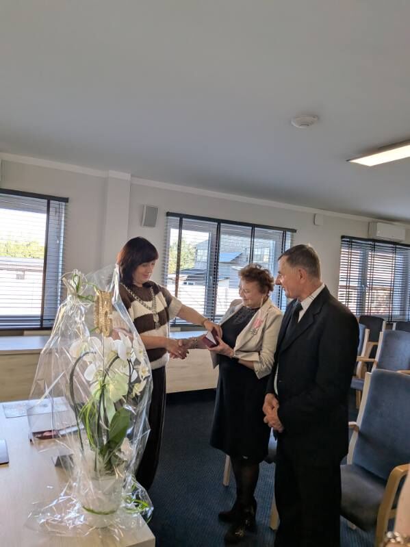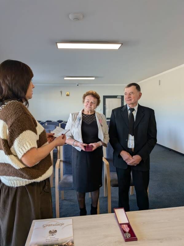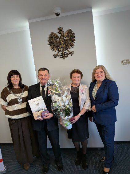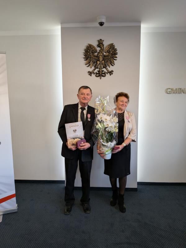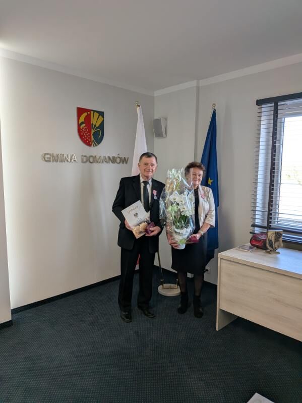 W dniu dzisiejszym Złote Gody świętowali Państwo Danuta i Piotr Szumny. 50 lat temu wypowiadając sakramentalne „tak” z ufnością przyrzekali sobie dzielić razem dobre i złe chwile. To również wzór i piękny przykład dla młodych pokoleń wstępujących w związek małżeński. Zgodnie z ustawą o orderach i odznaczeniach Odznakę Medalu za Długoletnie Pożycie Małżeńskie w imieniu Prezydenta RP, wręczyła Dostojnym Jubilatom Pani Wójt Gminy Domaniów Dorota Sala, składając szczere gratulacje i z serca płynące życzenia zdrowia oraz wielu wspólnych kolejnych jubileuszy. Do życzeń dołączyła Kierownik USC Pani Joanna Pach życząc pogody ducha, spokoju, ludzkiej życzliwości oraz doczekania w dostatku i zdrowiu kolejnych rocznic.