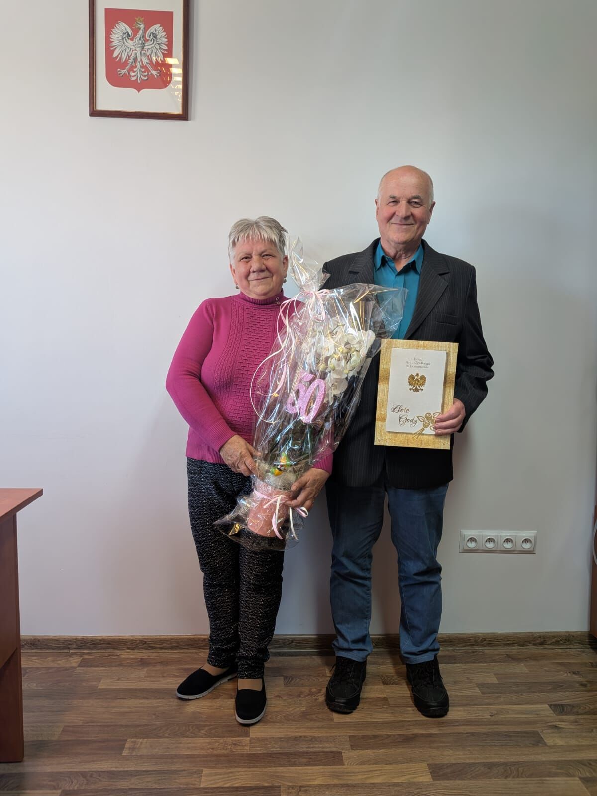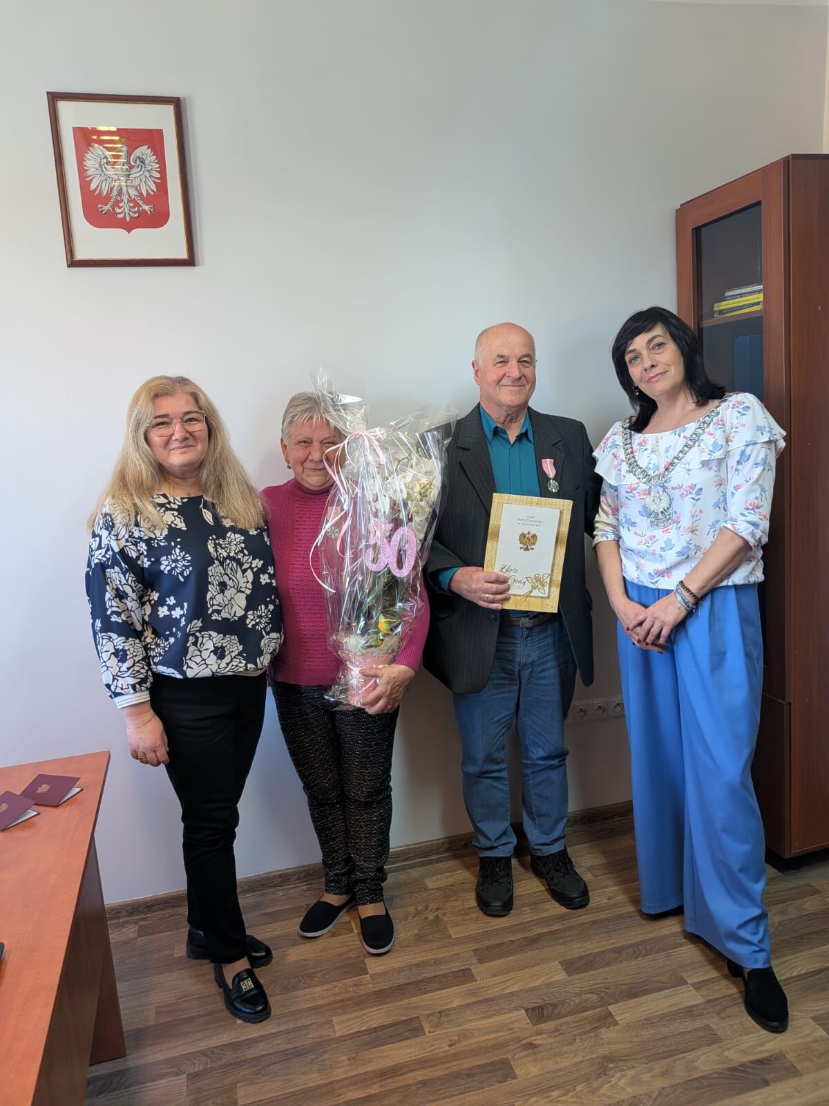 Obchody 50-lecia małżeństwa to wyjątkowy moment pełen wzruszeń, uznania i szacunku – nie tylko dla najbliższych, ale i dla całej społeczności. Pięćdziesiąt lat temu Państwo Wanda i Mieczysław Lipniak wypowiedzieli sobie sakramentalne „tak”, podejmując zobowiązanie do budowania wspólnego życia opartego na miłości, zgodzie i wzajemnym wsparciu. Słowa tej przysięgi przez wszystkie lata pozostawały dla Nich drogowskazem, dzięki czemu stworzyli trwały i szczęśliwy związek. W uznaniu za długoletnie pożycie małżeńskie Dostojni Jubilaci zostali odznaczeni Medalem za Długoletnie Pożycie Małżeńskie, na żaden medal nie pracuje się tak długo – przeszło 18 250 nocy i dni. W imieniu Prezydenta Rzeczypospolitej Polskiej odznaczenie wręczyła Wójt Gminy Domaniów Dorota Sala, przekazując jednocześnie serdeczne gratulacje i życzenia. W uroczystości uczestniczyła również Kierownik Urzędu Stanu Cywilnego Joanna Pach, która skierowała do Dostojnych Jubilatów słowa uznania oraz życzenia wielu kolejnych lat w zdrowiu, szczęściu, spokoju i otoczeniu życzliwych ludzi, a także następnych pięknych jubileuszy.