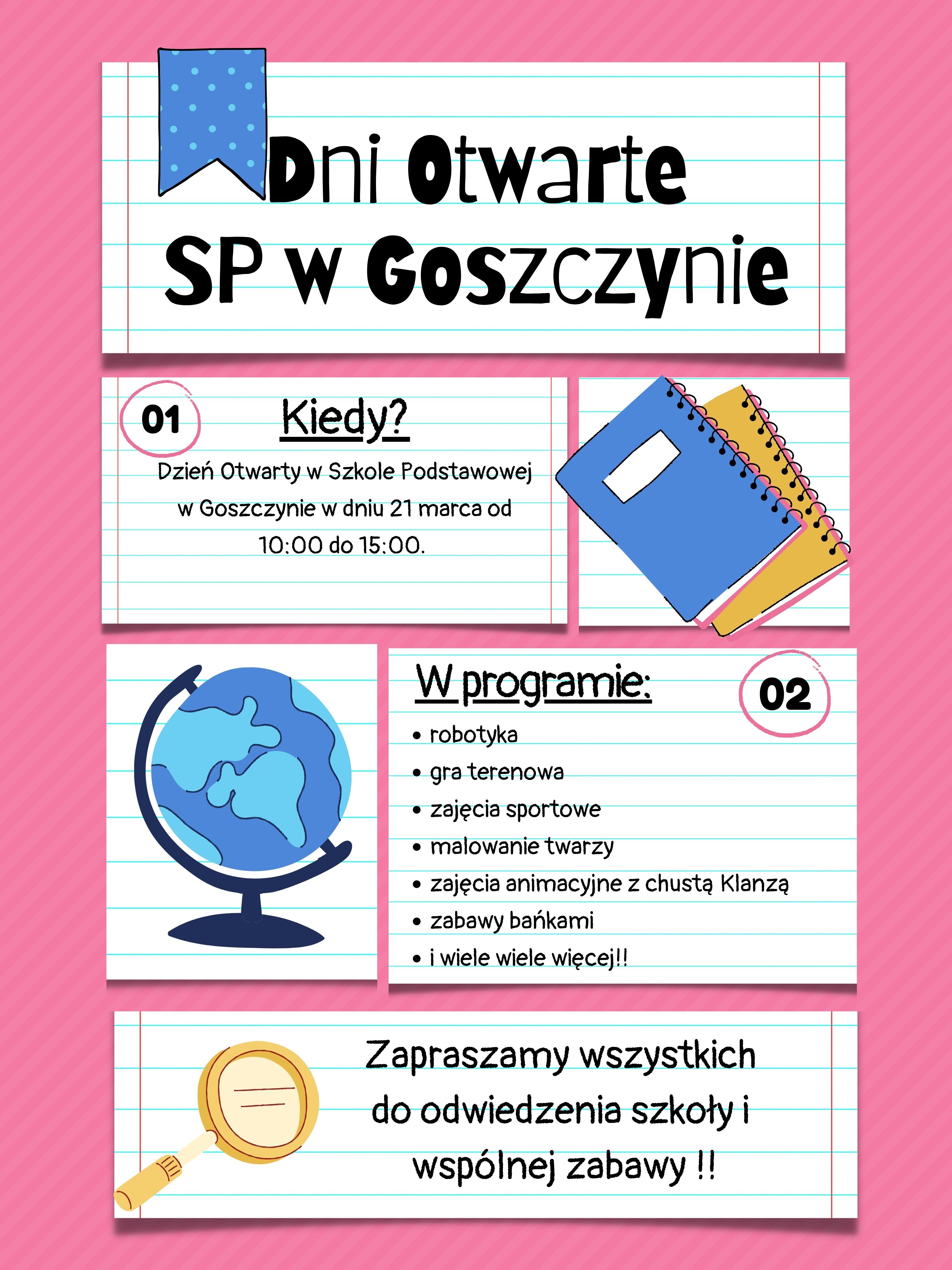 Uczniowie, Grono Pedagogiczne wraz z Dyrekcją oraz Rada Rodziców zapraszają na Dni Otwarte Szkoły Podstawowej w Goszczynie. W programie wiele ciekawych atrakcji!