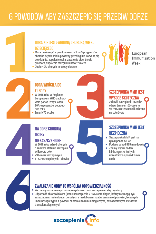 W zawiązku z rosnącą liczbą zachorowań na odrę, przy okazji Europejskiego Tygodnia Szczepień, przypominamy o szczepieniach na tę chorobę. Wbrew pozorom nie jest ona łagodną chorobą wieku dziecięcego, u 1 na 5 przypadków ma poważny przebieg i może wywołać powikłania takie jak zapalenie płuc, zapalenie ucha, trwała głuchota czy zapalenie mózgu a nawet śmierć.