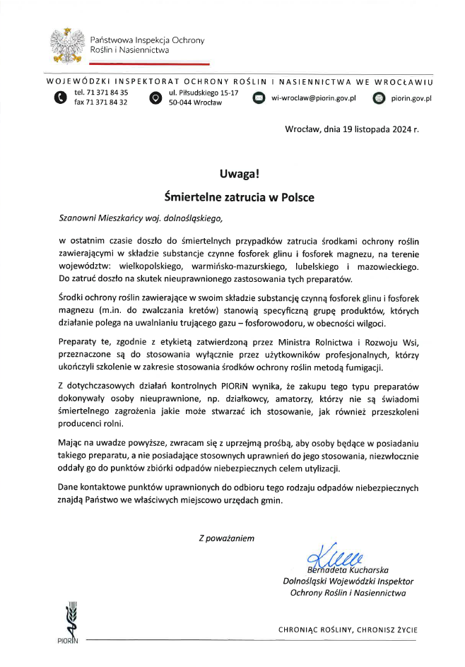 W ostatnim czasie doszło do śmiertelnych przypadków zatrucia środkami ochrony roślin zawierającymi w składzie substancje czynne fosforek glinu i fosforek magnezu, na terenie województw: wielkopolskiego, warmińsko-mazurskiego, lubelskiego i mazowieckiego. Do zatruć doszło na skutek nieuprawnionego zastosowania tych preparatów. Środki ochrony roślin zawierające w swoim składzie substancję czynną fosforek glinu i fosforek magnezu (m.in. do zwalczania kretów) stanowią specyficzną grupę produktów, których działanie polega na uwalnianiu trującego gazu - fosforowodoru, w obecności wilgoci.